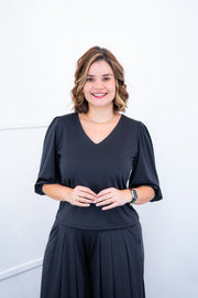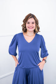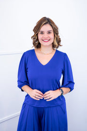 Seu decote V valoriza o colo com sutileza, trazendo um charme extra à peça, enquanto o mangá 3/4 adiciona um toque de sofisticação e novidades – perfeito para dias de temperatura amena ou para compor sobreposições elegantes.
