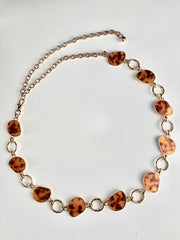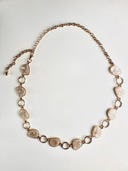 O Cinto de Correntes Orgânico Madre Pérola é a definição de charme e delicadeza. Com um design romântico e elegante, ele traz esferas orgânicas inspiradas em madre pérola nas cores caramelo e off-white delicadamente posicionadas ao longo da corrente, adicionando um toque de feminilidade e sofisticação a qualquer look.