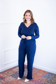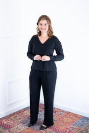 A parte de cima tem um corte em alfaiataria despojada, com decote em V e mangas com punho, que trazem um toque de elegante e delicadeza na medida certa.