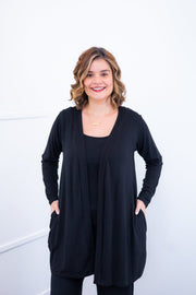 Confeccionado em viscolycra , um tecido leve, macio e com excelente caimento, o Twin Set Lúcia valoriza o corpo sem marcar, trazendo fluidez e movimento para a peça. A regata tem modelagem soltinha e alças largas, perfeita para os dias mais quentes ou para usar sob outras peças. Já o cardigan alongado conta com bolsos laterais discretos , ideal para quem não abre mão de funcionalidade no dia a dia — seja para carregar o celular, chaves ou simplesmente apoiar as mãos com estilo.