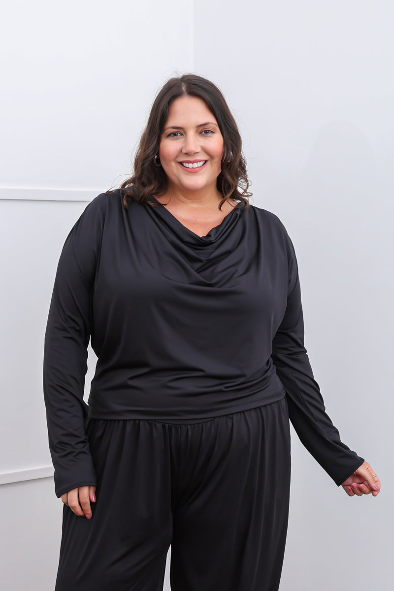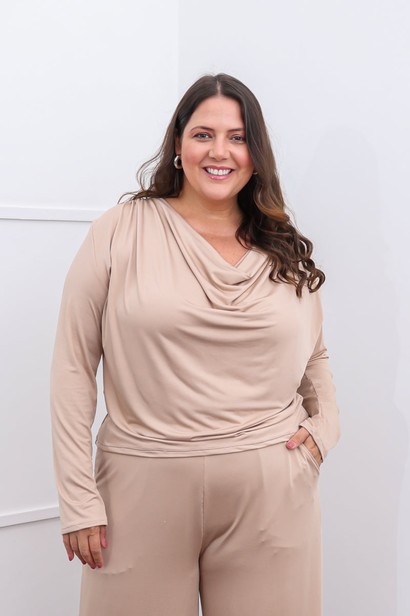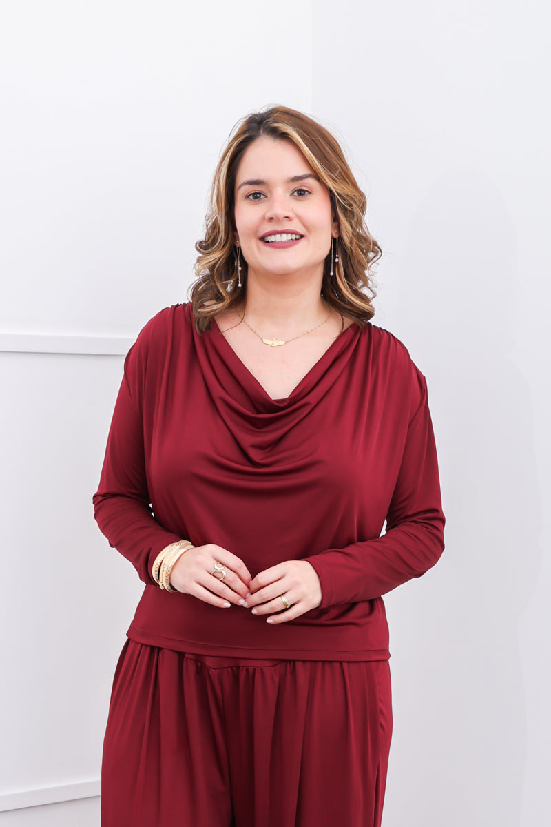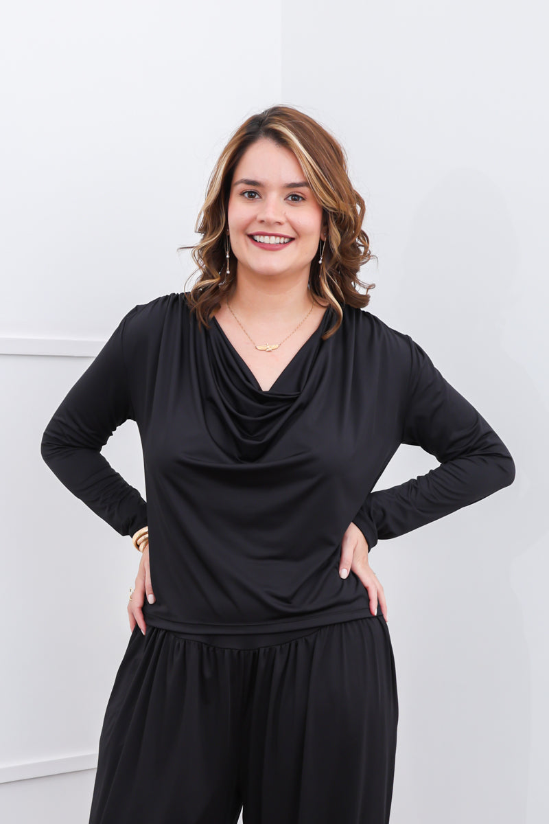 O grande destaque da peça é o decote drapeado, que valorizam o colo de forma delicada e feminina, trazendo charme e sofisticação ao visual. As mangas longas equilibram a modelagem e tornam a blusa perfeita para composições que vão do casual ao mais refinado.