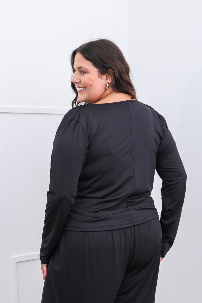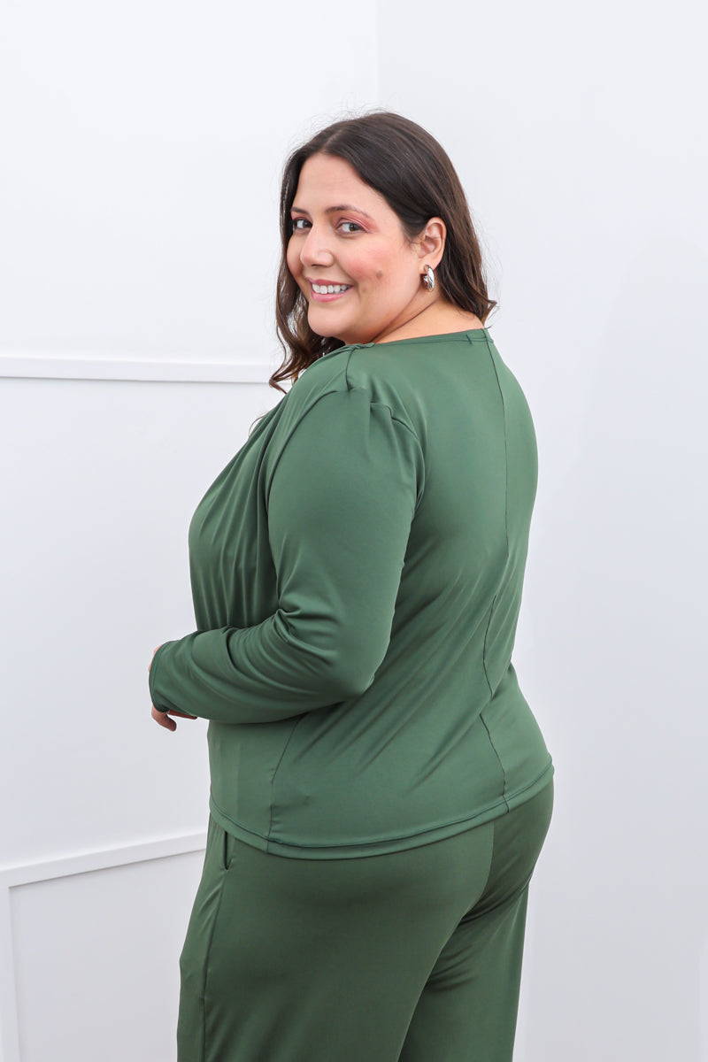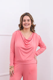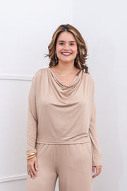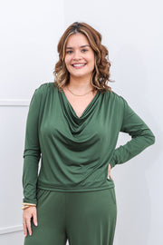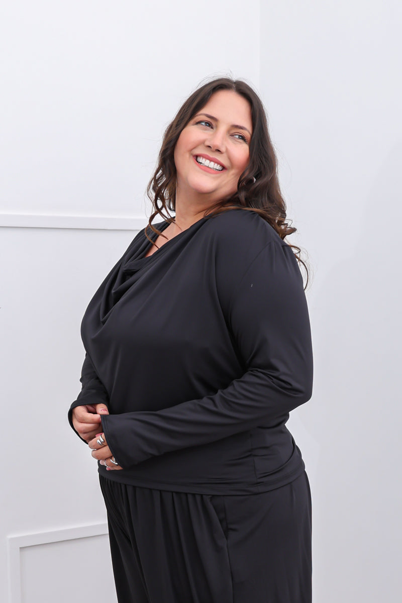 O grande destaque da peça é o decote drapeado, que valorizam o colo de forma delicada e feminina, trazendo charme e sofisticação ao visual. As mangas longas equilibram a modelagem e tornam a blusa perfeita para composições que vão do casual ao mais refinado.