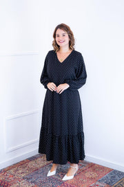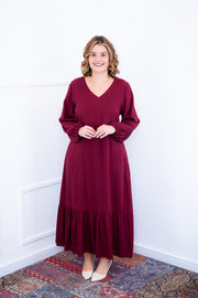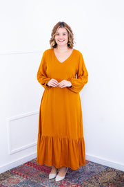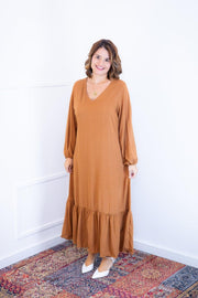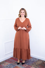 Seu decote V alonga a silhueta, enquanto o babado na barra adiciona movimento e delicadeza ao visual. O comprimento longuete traz elegância, perfeito para quem ama uma peça estilosa sem abrir mão do conforto.