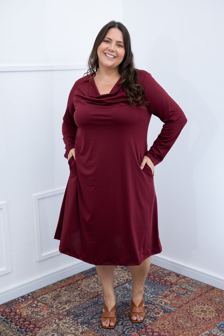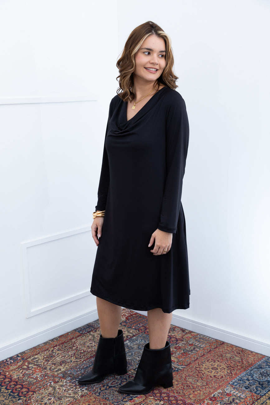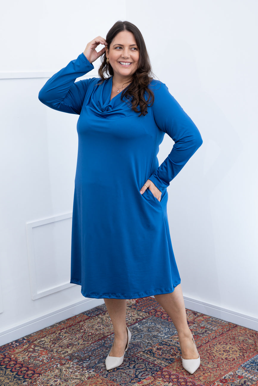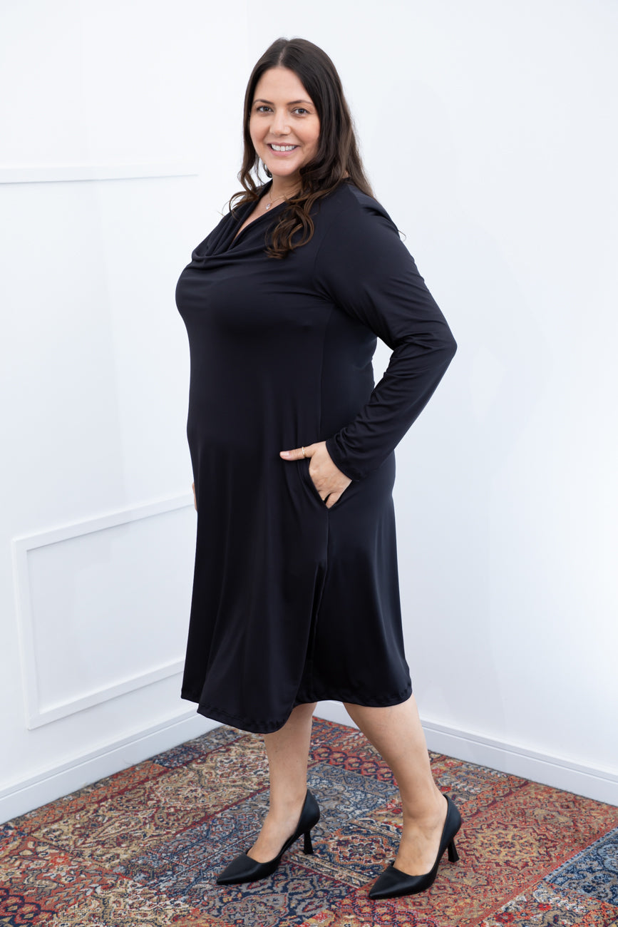 Vestido Sofia - Manga Longa com Gola Drapeada Midi em Malha Confort