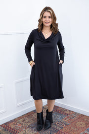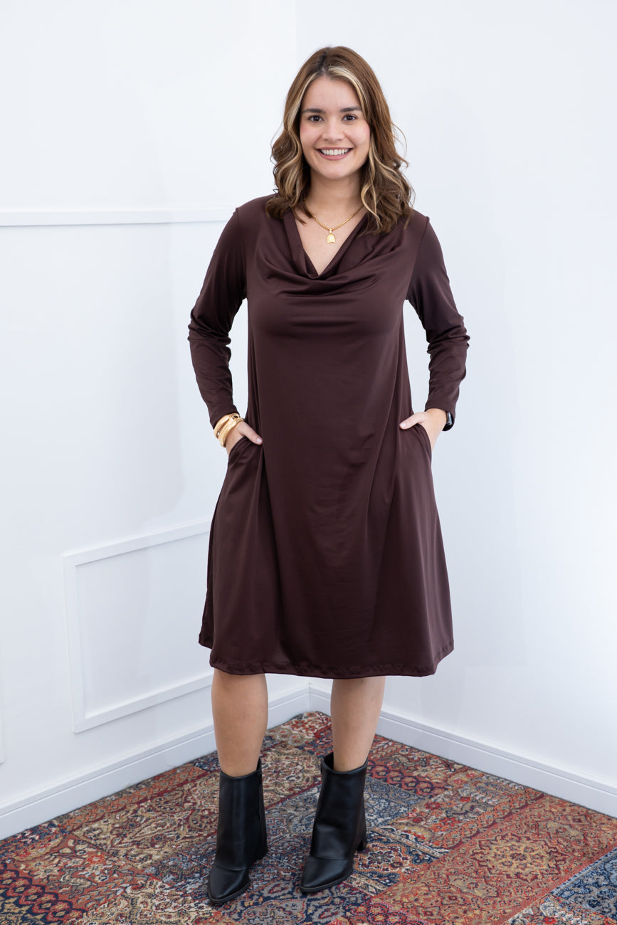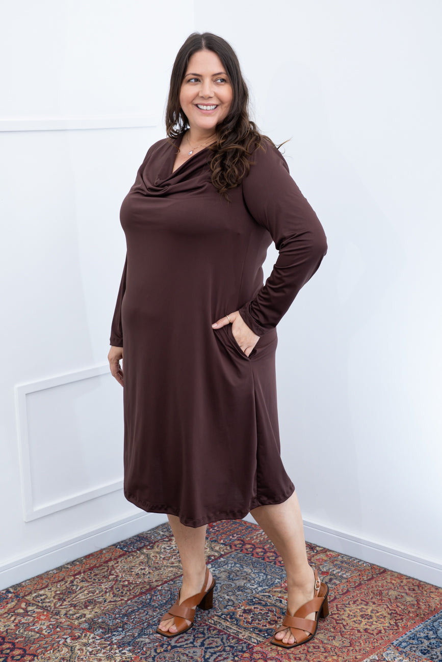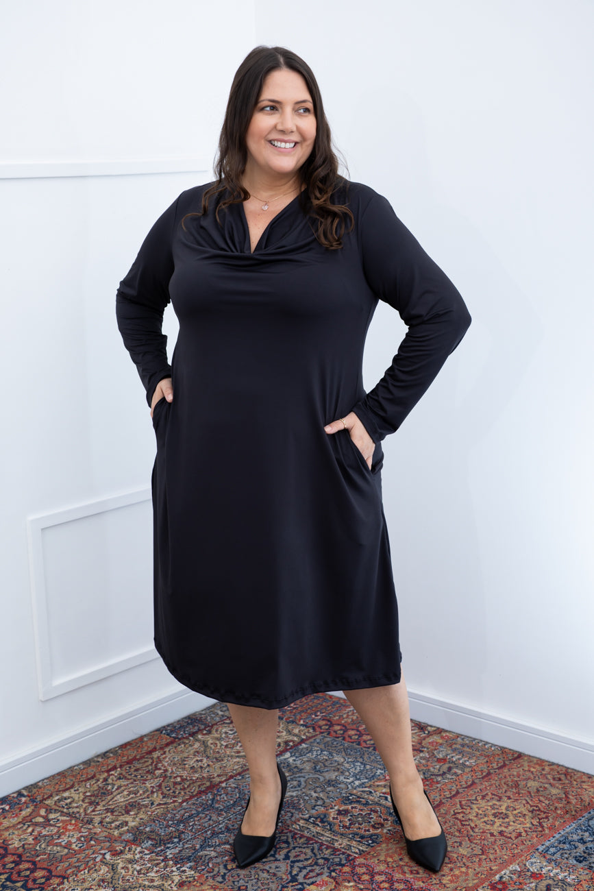 Vestido Sofia - Manga Longa com Gola Drapeada Midi em Malha Confort